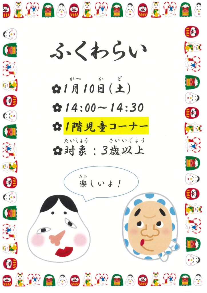 「ふくわらい」開催のお知らせ 2026年1月5日 お知らせ, イベント告知 1月10日(土)14:00より、「ふくわらい」を開催いたします✨ 場所は1階児童コーナー、対象は3歳以上です。 参加申し込みは不要ですので、皆様お気軽にご参加ください! Share: Older Post 暖房設備復旧のお知らせ