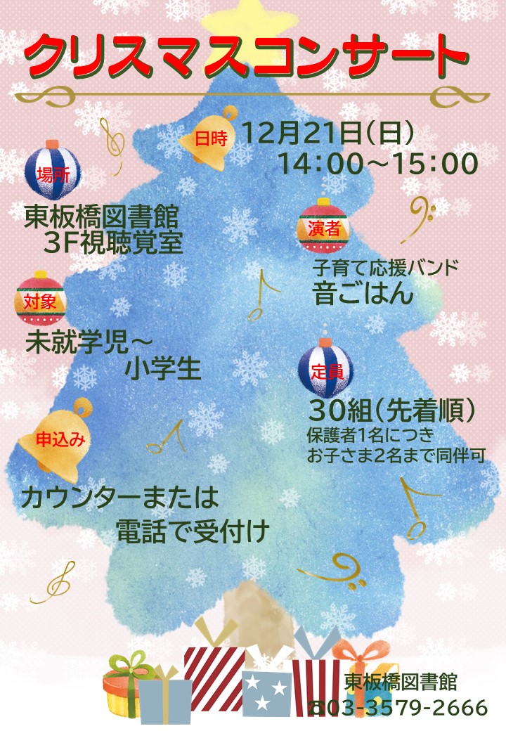 「クリスマスコンサート」の申込み受付けを開始しました 2025年11月30日 お知らせ, イベント告知 12月21日(日)に音ごはんさんをお迎えして開催する「クリスマスコンサート」の申込み受付けを開始しました。 対象は未就学児~小学生です。(保護者の方1名でお子様2名同伴可) 定員は30組(先着順)となります。 皆様のお申込みお待ちしております! Share: Older Post 「大人のためのおはなし会ー手話と絵本で楽しむ午後のひとときー」を終えて Newer Post 「東板橋図書館新春落語」の申込み受付けを開始しました