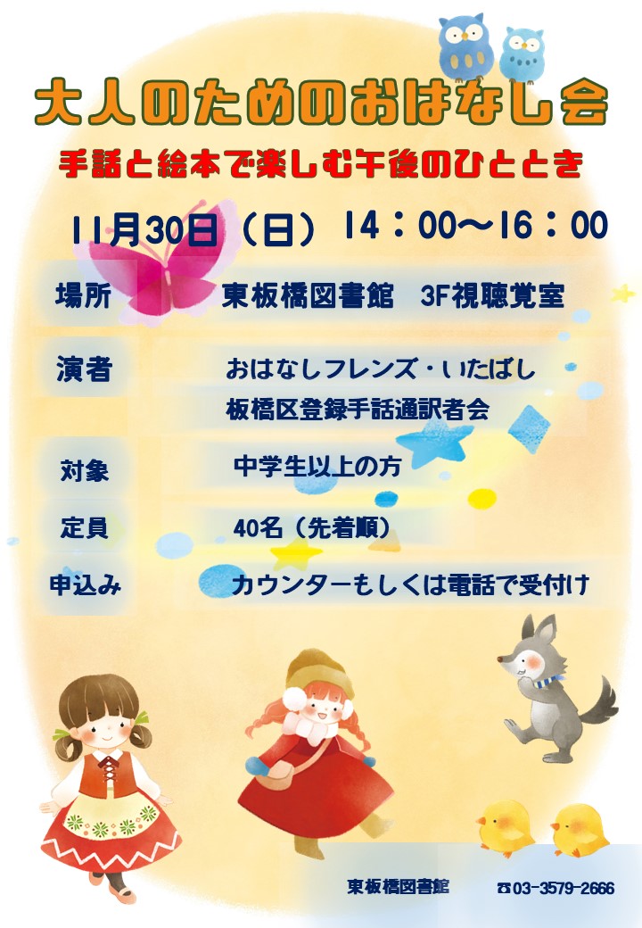 板橋区登録手話通訳者会から手話通訳者の方をお招きして同時通訳の手話が付くおはなし会は健常者の方でも聾者の方でも大人が絵本を楽しめるイベントです。