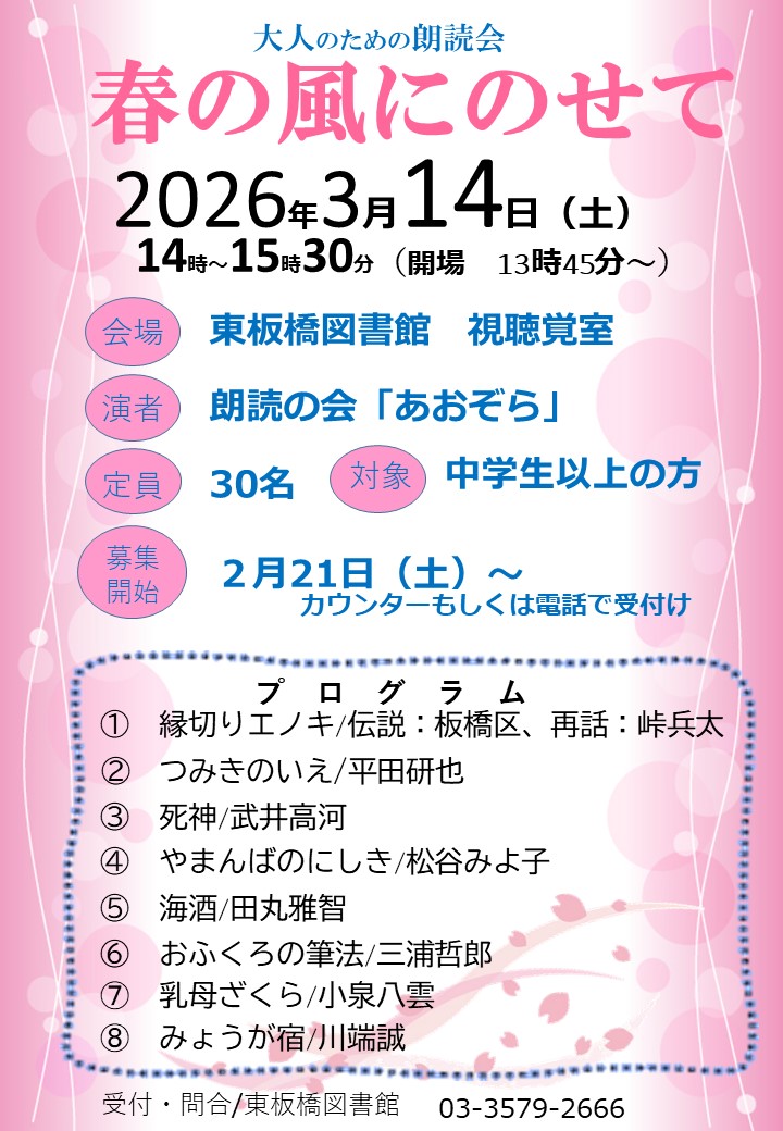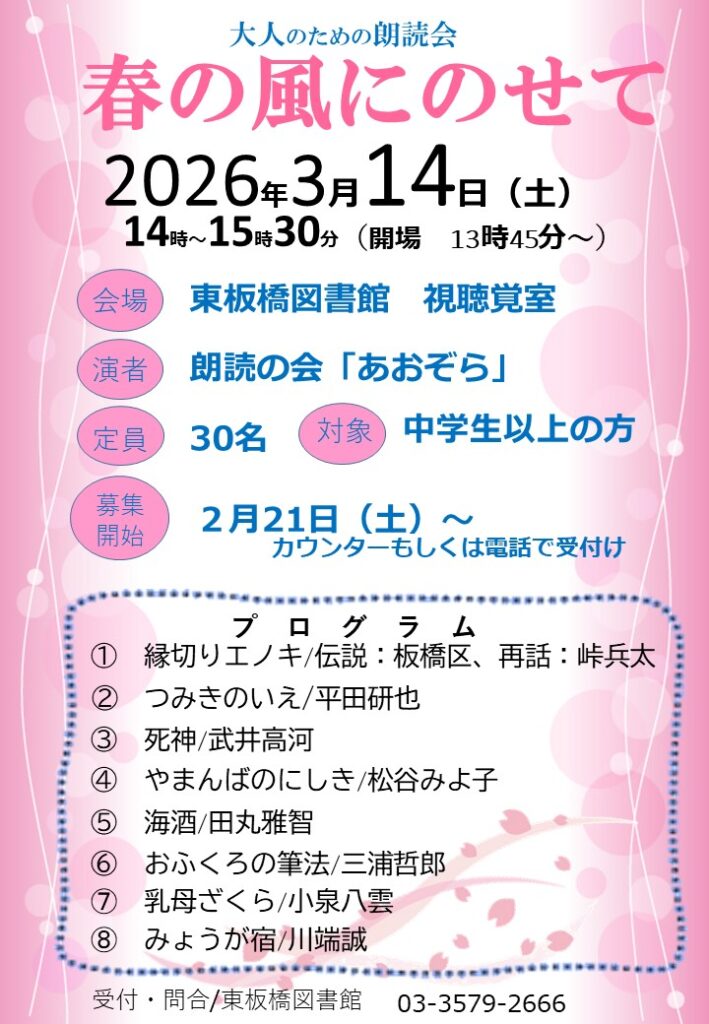 「大人のための朗読会」の申込み受付けを開始しました 2026年2月22日 お知らせ, イベント告知 3月14日(土)に朗読の会「あおぞら」の皆さんをお迎えして開催する「大人のための朗読会」の申込み受付を開始しました。 中学生以上の一般の方が対象で、定員は30名(先着順)です。 お申し込みは東板橋図書館1階カウンターもしくはお電話にてお待ちしております。 Share: Older Post 浮世絵講座「江戸の版元ー蔦屋重三郎を中心に―」を終えて Newer Post 「英語おはなし会」の申込み受付けを開始しました