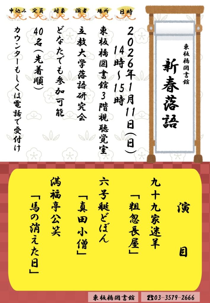 「東板橋図書館新春落語」の申込み受付けを開始しました 2025年12月21日 お知らせ, イベント告知, 重要なお知らせ 1月11日(日)に立教大学落語研究会の皆さんをお迎えして開催する「東板橋図書館新春落語」の申込み受付けを開始しました。 定員は40名(先着順)で、どなたでもご参加いただけます。 皆様のお申込みお待ちしております! Share: Older Post 「クリスマスコンサート」の申込み受付けを開始しました Newer Post 「いたばしカルタ大会」の申込み受付けを開始しました