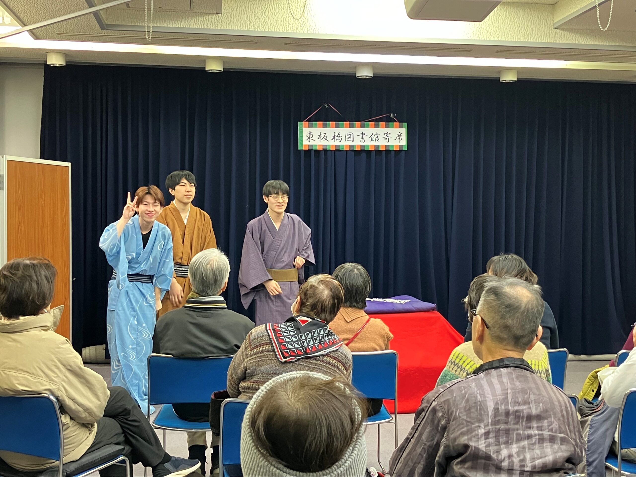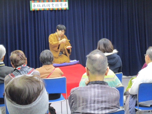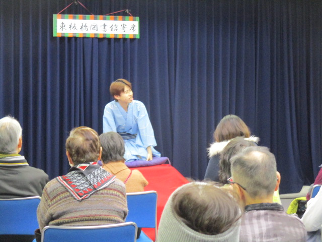 「東板橋図書館新春落語」を終えて 2026年1月11日 お知らせ, イベント報告 1/11(日)に「東板橋図書館新春落語」を開催しました。 今年は午年にちなんだ新作落語「馬が消えた日」と古典落語「真田小僧」「粗忽長屋」の2本を立教大学落語研究会の学生さんがやってくださいました。 毎年好評の立教大学の皆様の落語に参加された皆様もとても楽しまれた様子でした。 立教大学落語研究会の皆様、参加してくださった皆様ありがとうございました! Share: Older Post 「ふくわらい」を終えて