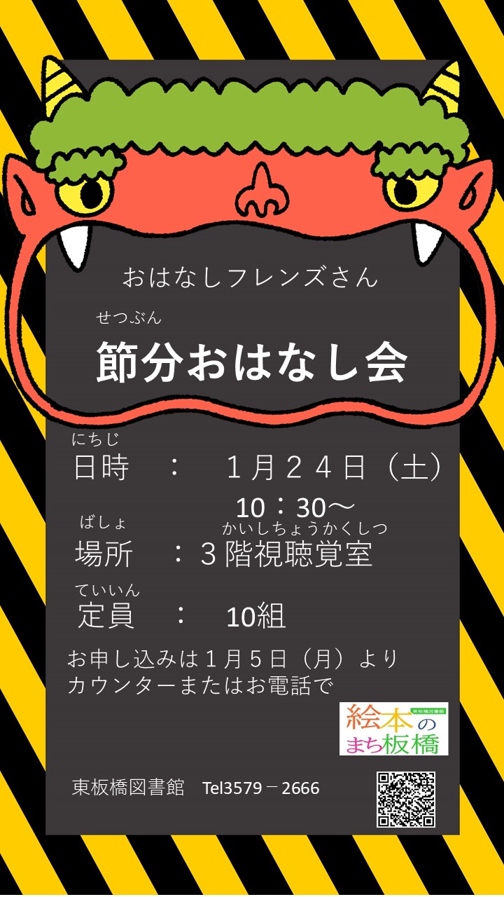 「節分おはなし会」の申込み受付を開始しました 2026年1月7日 お知らせ, イベント告知 1月24日(土)に開催する「節分おはなし会」の申込み受付を開始しました。 定員は10組、場所は3階視聴覚室です。 お申込みはカウンターまたはお電話にてお待ちしております。 Share: Older Post 「ふくわらい」開催のお知らせ Newer Post 「赤ちゃんおはなし会スペシャル 親子読みきかせ講座」申込み受付け中