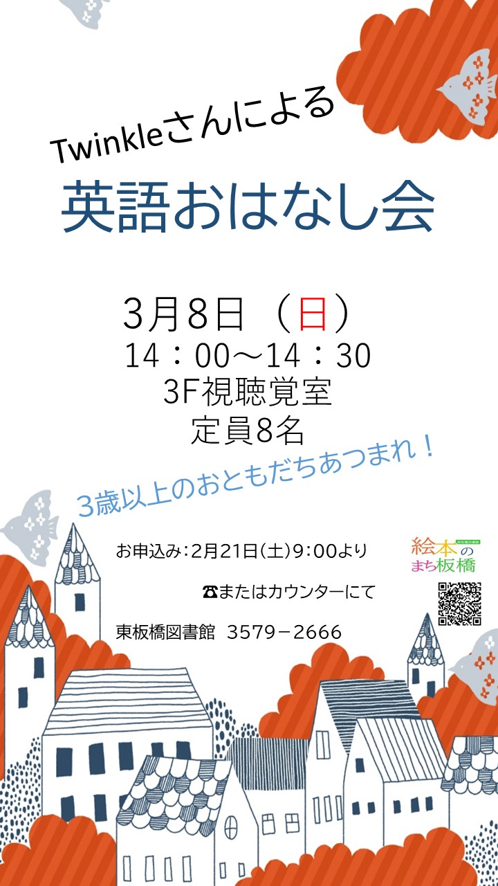 「英語おはなし会」の申込み受付けを開始しました 2026年2月22日 お知らせ, イベント告知 3月8日(日)に開催する「英語おはなし会」の申込み受付を開始しました。 対象は3歳以上で、定員は8名(先着順)です。 お申し込みは東板橋図書館1階カウンターもしくはお電話にてお待ちしております。 Share: Older Post 「大人のための朗読会」の申込み受付けを開始しました