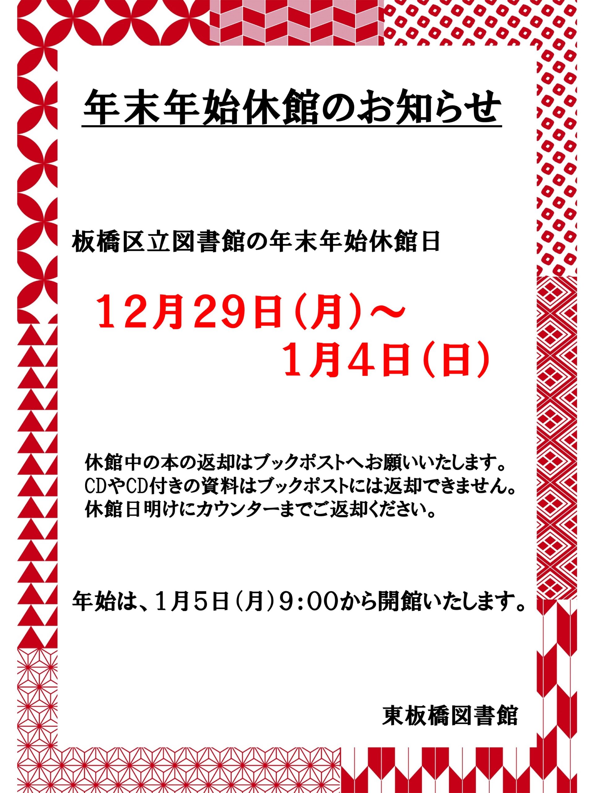 板橋区立図書館は、12月29日(月)~1月4日(日)まで年末年始のため休館いたします。