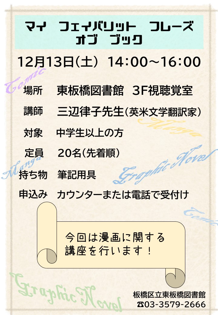 翻訳講座「マイ フェイバリット フレーズ オブ ブック」の申込み受付を開始しました 2025年11月27日 お知らせ, イベント告知, 重要なお知らせ 12月13日(土)に開催する翻訳講座「マイ フェイバリット フレーズ オブ ブック」の申込み受付を開始しました。 今回の内容は、英米文学翻訳家の三辺律子先生をお迎えして海外のマンガを題材にした翻訳のお話になります。日本のマンガ(海外で有名になったもの)についても触れます。 対象は中学生以上の方、定員は20名(先着順)です。 ご参加される方は、筆記用具をご持参ください。 皆様のご参加をお待ちしております! Share: Older Post 「クリスマスおはなし会」の申込み受付を開始しました
