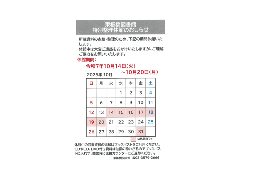 東板橋図書館は、明日10月14日(火)から10月20日(月)まで…