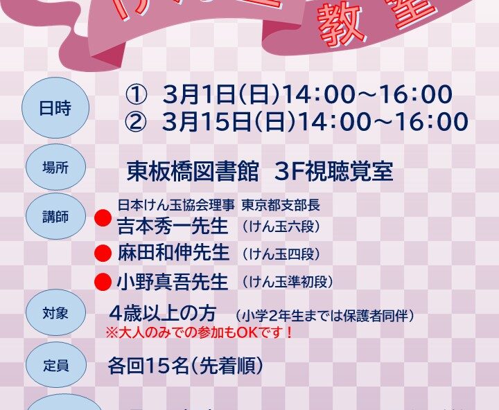 本日より、3月1日(日)と3月15日(日)に開催する「けん玉教室…