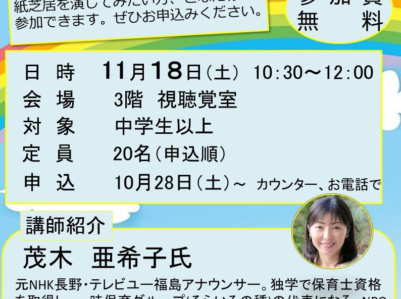 11月18日(土)に茂木亜希子先生をお迎えして、「紙芝居講座」開…