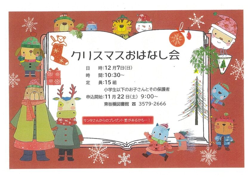 本日より、12月7日(日)に開催する「クリスマスおはなし会」の申…