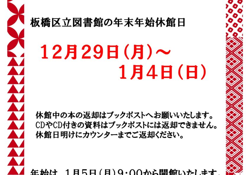 板橋区立図書館は、12月29日(月)~1月4日(日)まで年末年始…
