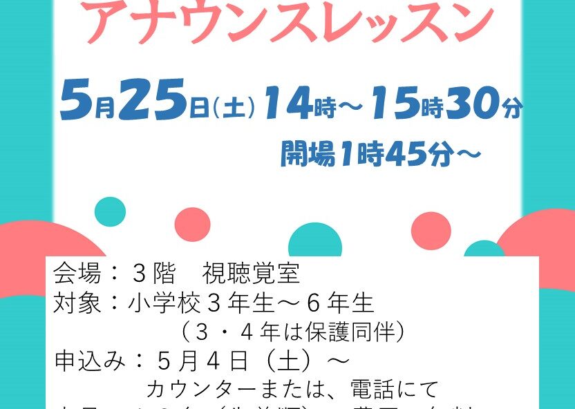5月25日(土)14時~子ども向けアナウンスレッスンを行います。…