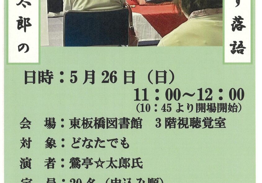 5月26日(日)11:00~開催の「鶯亭☆太郎のうぐいす落語」の…